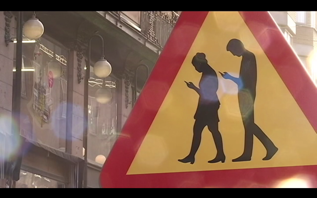 Det finns en ny varningsskylt i Stockholm. Den visar en man och en kvinna som tittar på sina mobiltelefoner medan de promenerar.