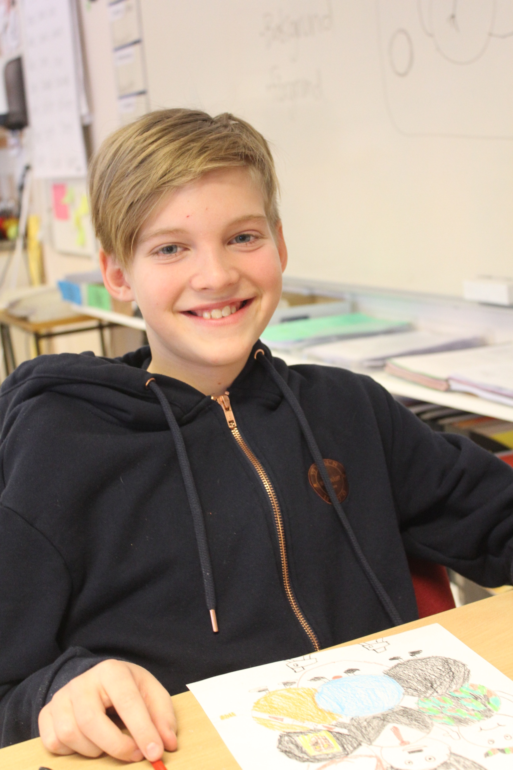 Vilmer sitter vid ett bord. Han har en blå hoodie och blont hår med sned lugg. Han ler stort mot kameran.
