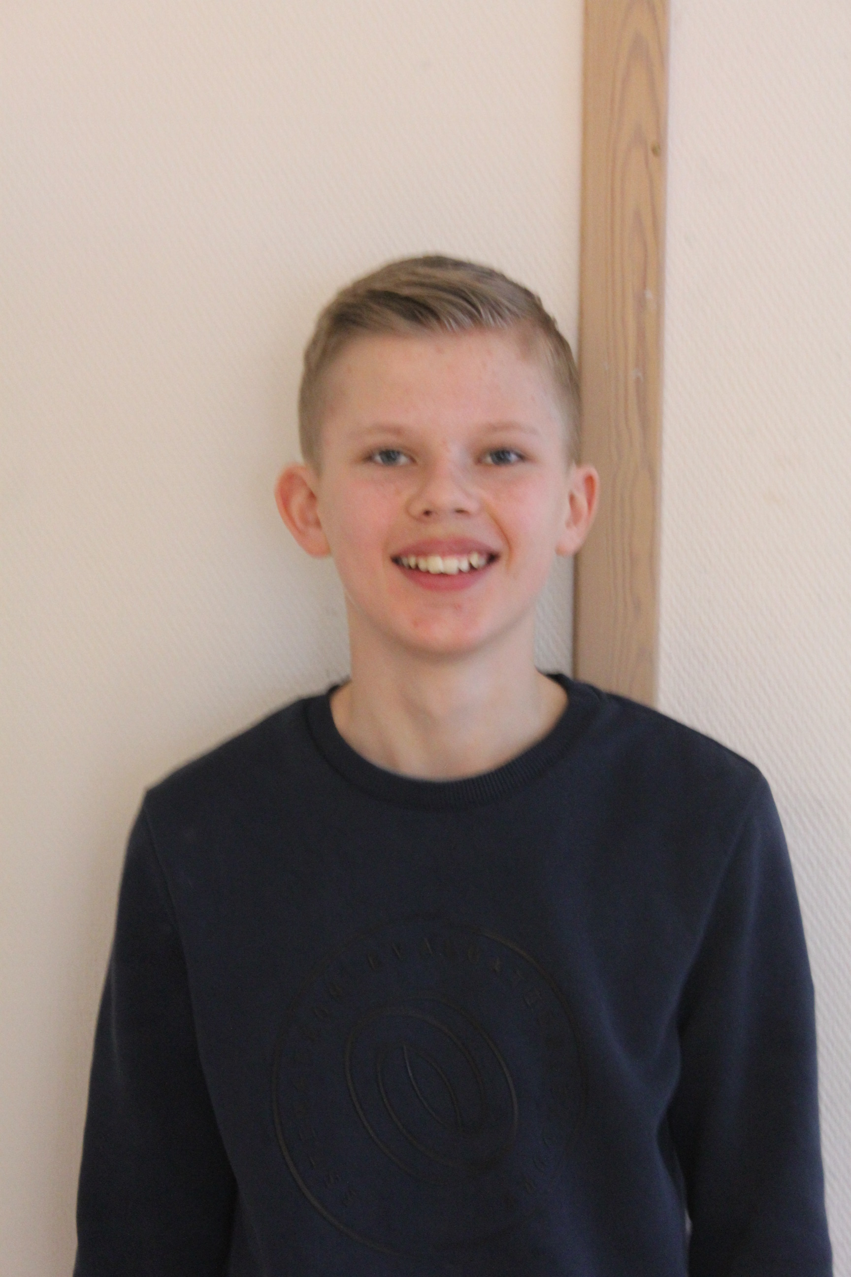 Adam står framför en vit vägg. Han har en blå längärmad tröja och blont hår med lugg som ligger åt sidan. Han ler mot kameran.
