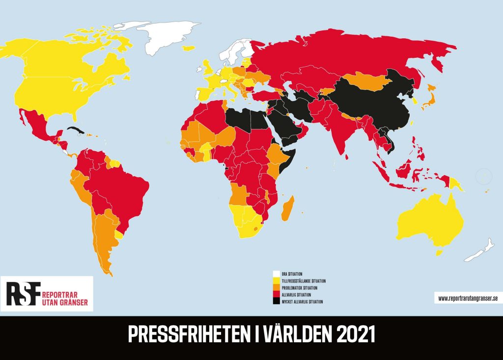 Pressfrihet i olika länder förra året. Foto: Reportrar utan gränser