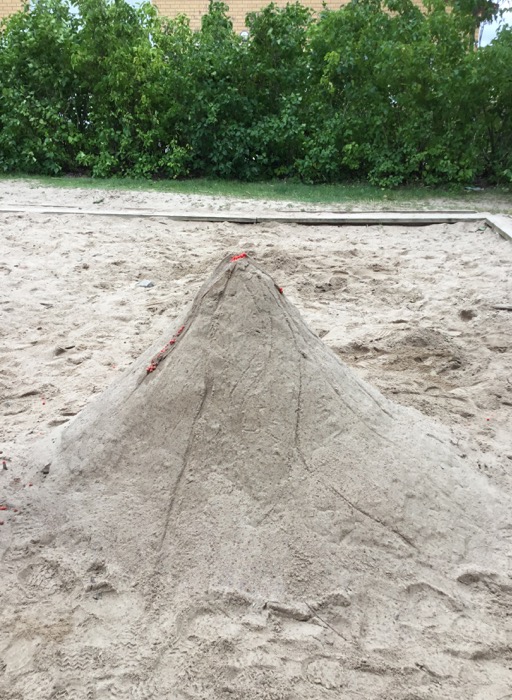 Vi har byggt en sandvulkan på vår lovdag. Sandvulkanen är 80 cm hög och 145 cm bred. Det var många som hjälpte till och ville hjälpa till. Det tog minst en och en halv timme och max två och en halv timme att bygga den.