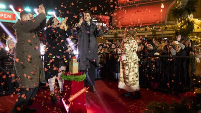Programledarna håller stora skyltar där det står hur mycket pengar och hur många engagemang det varit i Musikhjälpen i år. Runt dem regnar det konfetti.